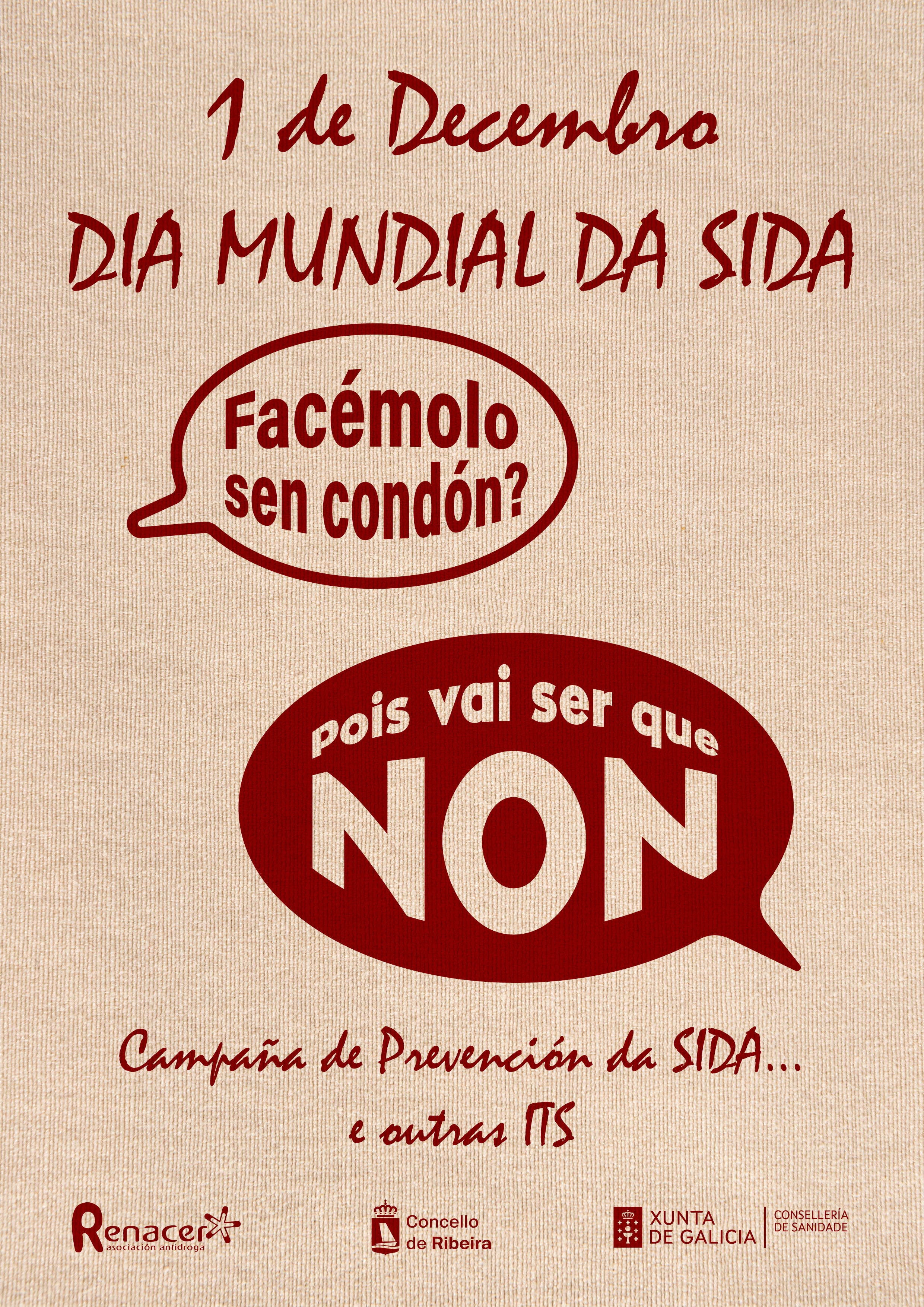 Desde a Asociación Renacer con motivo da conmemoración do Dia Mundial da SIDA, o 1 de decembro, desenvolveremos a campaña de sensibilización “Facémolo sen condón? Pois vai ser que NON”, coa mocidade en particular e a poboación en xeral de Ribeira e Boiro, tentando concienciar acerca da importancia da prevención na loita contra o VIH/Sida e outras infeccións de transmisión sexual, e a necesidade de involucrarse na detención precoz.