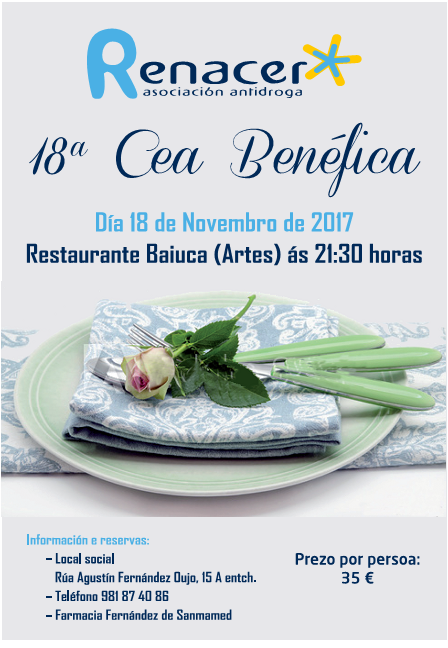 A Asociación Renacer celebrará o vindeiro día dezaoito de novembro a nosa 18ª Cea Benéfica. O obxectivo da mesma é é recadar fondos para poder continuar co desenvolvemento dos programas e servizos que esta entidade ten en funcionamento dado que, seguimos sufrindo importantes recortes nas subvencións que percibimos, o que dificulta en gran medida o noso funcionamento.